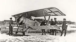 Two German imported DFW C.V reconnaissance planes were flown to Antrea in late March under the command of the Danish lieutenant Knud von Clauson-Kaas. The planes were not used in action as the Swedish pilots refused to fly in demanding conditions. On 10–11 April, six Russian pilots defected from Soviet Russia and joined the Finnish Whites with a Grigorovich M-9 flying boat, two Nieuport 10 reconnaissance planes and two Nieuport 17 fighters. The pilots were supporters of the Russian White movement. From 13 April, the Russian pilots made reconnaissance flights, bombed the Red positions and dropped propaganda leaflets. The planes operated from the Antrea Airfield, located on the ice of lake Päähkjärvi. This is considered to be the beginning of the Finnish Air Force.[7]