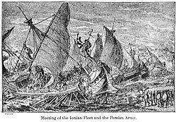 When the Persians saw the Allied fleet rowing towards them, they decided to seize the opportunity to attack, even though it was late in the day, as they thought they would win an easy victory. They quickly advanced on the much smaller Allied fleet.[50] However, the Allies had come up with a tactic for this situation, where they turned their "bows on to the barbarians, [and] they drew their sterns together in the middle".[49] This is usually taken to mean that they formed into a circle, with their rams pointing outwards; Thucydides reports that in the Peloponnesian War, Peloponnesian fleets twice adopted a circular formation, with their sterns together. However, Herodotus does not actually use the word circle, and Lazenby points out the difficulty of forming a circle of 250 ships (the Peloponnesian fleets had 30–40 ships). It is thus possible the Allies formed into more of a crescent formation, with the wings drawn back to prevent the Persian ships sailing around the Allied line. Whatever the case, it seems likely that this maneuver was intended to negate the superior Persian seamanship, and perhaps specifically the use of diekplous.[45]