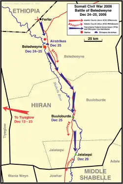 The Battle of Beledweyne occurred on December 24 to December 25, 2006, when Ethiopian troops seized that Somalia town from Islamic Courts Union fighters, according to some news agencies.[1] Beledweyne is 100 km north of Baidoa, the seat of Transitional Federal Government of Somalia.