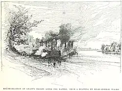 While embarking on the transports, the Confederates began reaching the riverside and began peppering the men and boats. The two Union woodenclads kept the attackers at bay, while the transport cut their hawsers and backed out into the current. While the riverboats were returning to Paducah, the missing Illinois regiment was seen marching upriver and the men were taken aboard.[17] In the retreat, Grant lost his bay horse, saddle, mess chest, and gold pen, while McClernand lost his "handsome iron-framed cot," field desk with dispatches, and an inkstand inscribed with his name.[18]