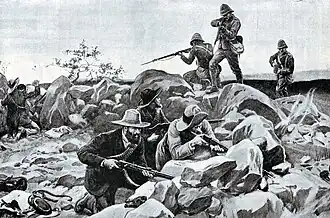 The Guards, the 9th Brigade and the Naval Brigade assaulted the Boers over open ground, suffering about 200 casualties. Before the British came to use their bayonets, the Boers retreated by pony and re-formed in another entrenched position at Graspan, where the pattern was repeated with the British suffering another 197 casualties: one sailor reporting that "at 200 yards we fixed bayonets, and we just saw their heels; they didn't wait when they heard the rattle".[1]