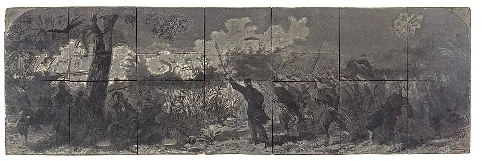 Meanwhile, Kilpatrick was trying to lead part of the 5th New York around the Confederates from the right but they came under heavy fire.[67] As men were falling, Lieutenant Colonel (later major general) Gouverneur K. Warren came forward on a white mule and began to lead the men toward a ford through the creek 0.75 miles (1.21 km) from the main road to Hampton. A platoon guarding the ford was outnumbered by the Union force and retreated as they approached. Magruder ordered Captain W. H. Werth forward with a howitzer company. Werth hurried to the ford and arrived before the Zouaves of the 5th New York Infantry under Duryee and Kilpatrick. Werth drove them off from the ford with a howitzer shot but they continued to fight from the wood line. Grape shot tore the rectangle off Colonel Duryee's left shoulder, wounded Captain Kilpatrick in the thigh, and killed a soldier behind them.[68][69] The 5th New York Infantry was exhausted from being the first unit on the march and from heavy action in the day's fighting so the unit was pulled back.[70] Kilpatrick, who was badly wounded by the shot through his thigh, had to be rescued and carried away by Captain Winslow at the very end of the battle after his regiment had withdrawn. Otherwise, he would have fallen into Confederate hands.[71]