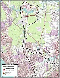 Most of the Big Bethel battlefield, and the whole Little Bethel site, have not been preserved. Today the sites are generally covered with residential and commercial development. Marsh Creek or Brick Kiln Creek has also been dammed, creating the Big Bethel Reservoir on the battlefield site. The fragments of the site that remain are not readily identifiable.[105] The site of Lt. Greble's death is now a convenience store. A group of local preservationists has developed a plan to preserve areas, currently located on Langley Air Force Base, containing a remnant of an earthwork and the memorial to Henry Lawson Wyatt, the only Confederate soldier killed in the battle.[106]
