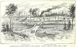 Almost the entire Confederate force was now behind earthworks and north of Marsh Creek (Brick Kiln Creek), the branch of the Back River at Big Bethel. The exception was that some of the 3rd Virginia Infantry were in an open field to the south of the branch to protect a howitzer position which was intended to block the main Yorktown–Hampton road.[47] These men hurriedly tried to entrench and to find other cover, such as old mill dam, as the Union force approached.[54] The Confederate force consisted of the same units that Magruder had sent to Big Bethel a few days earlier: Colonel Hill's 1st North Carolina Volunteer Infantry (about 800 men), three companies of Lieutenant Colonel William D. Stuart's 3rd Virginia Infantry (208 men), a cavalry battalion of about 100 men under Major Montague, and the Richmond Howitzer Artillery Battalion of about 150 men under Major George W. Randolph.[55]