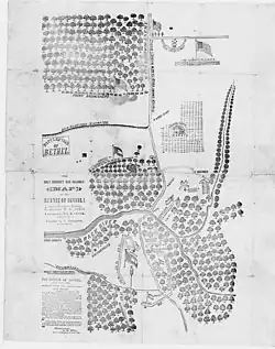 After the attack by Bendix's men, Peirce pulled his force back south of the New Market Bridge, a counter-march of about 1.5 miles (2.4 km) to assess the situation and to await an expected further Confederate attack in a more advantageous position.[44] To the dismay of all, it was soon discovered that Bendix had opened fire with muskets and an artillery piece on the 3rd New York Infantry and the commanding general's party, wounding 21 men (two mortally) and causing dozens of other men to flee the field.[45] At this time, the colonels of various regiments, in particular Duryea and Washburn, advised Peirce to call off the operation.[46] However, Butler's aides, Major Winthrop and Captain Haggerty, urged Peirce to move forward,[46][47] and he chose to continue with the attack.