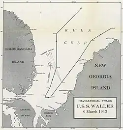 As the Japanese ships withdrew through the Kula Gulf after landing their cargo, they encountered Task Force 68 (TF 68), consisting of three light cruisers (USS Montpelier, Cleveland, and Denver) and three destroyers (USS Conway, Cony, and Waller) commanded by Rear Admiral Aaron S. Merrill. This force was en route to commence bombarding Japanese positions at Vila. Two submarines, Grayback and Grampus, had been assigned to support Merrill's force and were stationed along likely Japanese withdrawal routes out of the Kula Gulf. Merrill's attack on Vila was timed to coincide with another attack on Munda by four destroyers under Captain Robert Briscoe.[4]