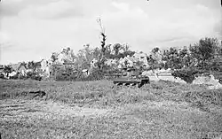 At midday on 12 June the entire 3rd Parachute Brigade position came under artillery and mortar fire prior to a major attack scheduled to start at 15:00. A German battalion attacked the 1st Canadian Parachute Battalion, another supported by six tanks and self-propelled guns attacked the 9th Parachute Battalion and the 5th Black Watch.[17] The battle for the Château cost the Black Watch nine Bren Gun Carriers and destroyed all of their anti-tank guns. Unable to resist they were forced to pull back to the Bois de Mont, joining the 9th Parachute Battalion, which was being attacked by the German armoured vehicles. One tank in front of 'B' Company was hit by two PIAT rounds, but remained in action.[17] The tank destroyed two of 'B' company's machine-gun posts, when it was hit by a third anti-tank projectile and withdrew.[27] The attack killed or wounded the last men in the Machine-Gun Platoon and the Anti-Tank Platoon was reduced to one PIAT detachment.[28] The German infantry were in danger of over-running the battalion, when Otway contacted brigade headquarters, informing them they were not able to hold out much longer. Brigadier James Hill personally led a counter-attack of forty men from the Canadian battalion which drove off the Germans.[29] By 20:00 the area defended by the two battalions had been cleared of all opposition and the front line restored.[30]