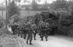 The German 346th Infantry Division reached the area from its base at Le Havre. Their first attack, by the 744th Grenadier Regiment, was against the 1st Special Service Brigade. Attacking in strength, they were near to breaking through the line when No. 3 Commando counter-attacked and drove them back.[10] Later in the morning, No. 6 Commando came under artillery and mortar fire from Bréville. The commandos attacked and cleared the village of Germans, capturing several prisoners, some machine-guns and four artillery pieces. Then they withdrew to their original position.[8] The Germans reoccupied the village and formed their own defensive positions, facing the ridge line defended by 6th Airborne Division.[10] Their positions also isolated the 9th Parachute Battalion, which was almost cut off from the rest of the division.[11] The next day a patrol from the 9th Parachute Battalion reconnoitred the Château Saint Come. They found it abandoned, but the presence of clothing, equipment, a half-eaten meal and a payroll containing 50,000 French francs betrayed the recent German occupancy.[11]