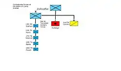 The Union force awaited Zollicoffer's Confederate troops who had to pass the stronghold at Camp Wildcat to proceed into central Kentucky. Zollicoffer was unaware that the camp had been reinforced and further mistook a column of Union reinforcements arriving during the afternoon of October 20 as the entire Union force preparing for battle.[21] Union pickets skirmished with the Confederates on the evening of October 20 and returned to camp to report that a large Confederate force was nearby.[21]