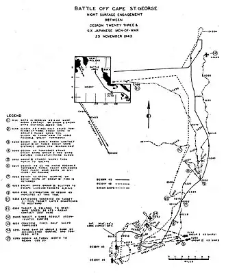 The Battle of Cape St. George was a naval battle of the Pacific campaign of World War II fought on 25 November 1943, between Cape St. George, New Ireland, and Buka Island (now part of the North Solomons Province in Papua New Guinea). It was the last engagement of surface ships in the Solomon Islands campaign. During the engagement, a force of five US Navy destroyers led by Captain Arleigh Burke intercepted a similar sized Japanese force that was withdrawing from Buka towards Rabaul, having landed reinforcements on the island. In the ensuing fight, three Japanese destroyers were sunk and one was damaged, with no losses amongst the US forces.