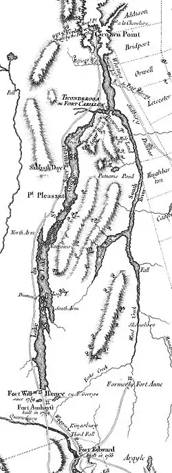To the north of the fort was a road going to Fort St. Frédéric. To the west was a low rise of land, beyond which lay Mount Hope, a rise that commanded part of the portage trail, but was too far from the fort to pose it any danger.[8] The most serious geographic defect in the fort's location was Mount Defiance (known at the time of this battle as Rattlesnake Hill, and in the 1770s as Sugar Bush), which lay to the south of the fort, across the La Chute River. This 900 foot (270 m) hill, which was steep and densely forested, provided an excellent firing position for cannon aimed at the fort.[9] Nicolas Sarrebource de Pontleroy, Montcalm's chief engineer, said of the fort's site, "Were I to be entrusted with the siege of it, I should require only six mortars and two cannon."[10]