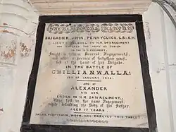 Picture of the plaque erected in St James Church Sialkot Cantonment by Sarah Pennycuick, widow of Brigadier John Pennycuick and mother of Alexander of 24th Regiment, both of whom died in Battle of Chillianwala on 13 January 1849.