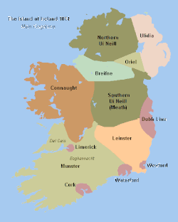 From the time of the seventh century and the reign of Domnall mac Áedo, the kingship of Tara was a title which was strongly associated with the high kingship of Ireland and was held by members of the Uí Néill dynasty, who controlled the northern half of Ireland.[8] In the tenth century, the Dál gCais, until then a small kingdom in what is now County Clare, began to expand. By the time of his death in 951, Cennétig mac Lorcáin had become King of Thomond. His son, Mathgamain mac Cennétig, was King of Munster when he died in 976.[9] Mathgamain's brother, Brian Boru, quickly asserted his claim to the kingship of Munster, then invaded Leinster and gained its submission.[10] In 998 he attacked the Uí Néill stronghold of Meath. Máel Sechnaill responded by attacking Munster in 999, and over the following years the two kings struggled for supremacy in Ireland. In 997, Brian and Máel Sechnaill met in Clonfert and reached an agreement where they recognised each other's reign over their respective halves of the country—Máel Sechnaill in the north and Brian in the south. Brian received the hostages of Leinster and Dublin from Máel Seachnaill, and surrendered the hostages of Connacht to him.[10] The peace was short-lived. After they had jointly defeated the Vikings at Glenmama, Brian resumed his attacks on Máel Seachnaill.[11] He marched on Tara in 1000 with the combined armies of Munster, Osraige, Leinster, and Dublin, but after an advance party consisting of the latter two groups was destroyed by Máel Sechnaill, Brian Boru withdrew from the area without giving battle.[12] In 1002 he marched with the same army to Athlone, and took the hostages of Connacht and Meath. He was now the undisputed High King of Ireland.[13]