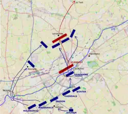 Acting on Pichegru's orders, Souham, who had withdrawn back to Aalbeke at the end of the day after the battle of Willems, turned his division back toward Courtrai.[13] On 11 May, Souham sent the brigades of Daendels and Winter to reinforce Vandamme at Courtrai.[14] Meanwhile, Souham ordered the brigades of Macdonald and Malbrancq to cross the Lys at Menin, and move northeast against Clerfayt.[13] The battle started at 3:00 pm and lasted until 10:00 pm. At first, Clerfayt's troops defended themselves stoutly, but by 6:00 pm Vandamme, Daendels, and Winter cleared their enemies from the Courtrai suburb. Soon after, Clerfayt unleashed a cavalry charge which dispersed Daendels' brigade.[14] However, at this time Malbrancq's brigade was able to join the fighting, the bulk of which was now centred at Lendelede, 4 mi (6 km) north of Courtrai.[16] Macdonald's brigade was unable to reach the battlefield before the end of the battle, only getting as far as Moorsele.