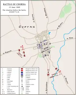 From a spy, Kmety heard that an imperial half brigade (2690 soldiers) led by Major General Franz Wyss was stationed in the city of Csorna.[16] Kmety wanted to profit from this opportunity and decided to make a surprise attack against Csorna.[16] The Wyss brigade was subordinate to the Imperial I. Corps under the command of Lieutenant General Franz von Schlik, with its headquarters at Magyaróvár. The brigade had to occupy Kapuvár and Csorna as a vanguard of the I. corps.[16] The brigade was divided into 2 columns, Wyss marched to Csorna with 2,690 soldiers - 2 battalions, two Kaiserjäger companies, 4 uhlan squadrons - and 8 guns, while in Kapuvár he had 2,026 men - 2 battalions, 2 uhlan squadrons - and 3 guns.[16] The city was at 40 km distance from Pápa, requiring 16 hours of marching, an exhausting task for the Hungarian Honvéd troops, but he set his troops on the march.[14] Kmety's division was characterized by a Honvéd officer in the "Győri Közlöny" newspaper: The ragged-looking, the worn-down division was superbly disciplined, accustomed to battle; - led by skilled officers, with unbounded confidence in its commander. Kmety himself was loved by his soldiers: gave nothing to his appearance, and he had his uniform made only for the occasion when he was sent to Kossuth with the news of the capture of Buda Castle. Otherwise, he wore a simple honvéd mackinaw, leather trousers, rider's boots with large spurs, mostly without any distinguishing marks, and an ordinary officer's cap (...) this was his winter and spring attire, until in the summer he replaced the mackinaw with a sleeveless coat (...) (Hazánk, 1888).[16]
