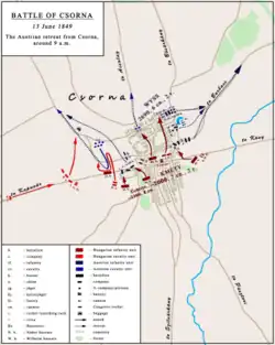 - ^ Some sources affirm that the 45th battalion's attack was joined also by the Nádor hussars, but others claim that they participated in the famous skirmish with the Austrian uhlans at the Western edge of Csorna.[28]