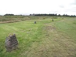 It was the last pitched battle fought on British soil.[62] Today, a visitor centre is located near the site of the battle. It was first opened in December 2007, with the intention of preserving the battlefield in a condition similar to how it was on 16 April 1746.[63] One difference is that it currently is covered in shrubs and heather. During the 18th century, however, the area was used as common grazing ground, mainly for tenants of the Culloden estate.[64] Those visiting can walk the site by way of footpaths on the ground and can also enjoy a view from above on a raised platform.[65] Possibly the most recognisable feature of the battlefield today is the 20-foot (6 m)-tall memorial cairn, erected by Duncan Forbes in 1881.[61] In the same year, Forbes also erected headstones to mark the mass graves of the clans.[66] The thatched roofed farmhouse of Leanach that stands today dates from about 1760; however, it stands on the same location as the turf-walled cottage that probably served as a field hospital for government troops following the battle.[64] A stone, known as "The English Stone", is situated west of the Old Leanach cottage and is said to mark the burial place of the government dead.[67] West of this site lies another stone, erected by Forbes to mark the place that the body of Alexander McGillivray of Dunmaglass was found after the battle.[68][69] A stone lies on the eastern side of the battlefield and is supposed to mark the spot from which Cumberland directed the battle.[70] The battlefield has been inventoried and protected by Historic Scotland under the Historic Environment (Amendment) Act 2011.[71]