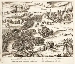 After a brief reconnaissance, Dávila, together with the Count of Eberstein and the cavalry companies under captains don Alonso de Vargas and Nicolò Basta, charged across the plain and frontally lunged over the rebel squadrons, which they broke.[10] Villers then lost most of his cavalry and two flags.[1][2] He and some 1,300 men retreated in some order with part of the baggage and managed to reach Dahlen, under whose walls they entrenched to withstand a second attack.[1][2]