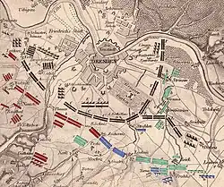 After being reinforced overnight with Victor's II Corps, Marmont's VI Corps and the Guard Cavalry, Napoleon attacked the following morning on 27 August in a steady rain, destroyed the coalition left flank, and won an impressive tactical victory. The flooded Weisseritz cut off a large portion the left wing of the Coalition army, commanded by Johann von Klenau and Ignaz Gyulai, from the Coalition's main body in the center. Marshal Joachim Murat took advantage of this isolation and inflicted heavy losses on the Austrians.[5] A French participant observed, "Murat.... cut off from the Austrian army Klenau's corps, hurling himself upon it at the head of the carabineers and cuirassiers. .... Nearly all his [Klenau's] battalions were compelled to lay down their arms, and two other divisions of infantry shared their fate."[6] Of Klenau's force, Lieutenant Field Marshal Joseph, Baron von Mesko de Felsö-Kubiny's division of five infantry regiments was surrounded and captured by Murat's cavalry, which amounted to approximately 13,000 men, and 15 colours. Mesko was wounded, and retired the following year.[7] Gyulai's divisions also suffered serious losses when they were attacked by Murat's cavalry supported by Victor's II Corps during a rainstorm. With damp flints and powder, their muskets would not fire and many battalions became an easy prey to the French cuirassiers and dragoons.