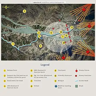 Due to his actions during the battle, former Army Captain William D. Swenson was recommended to receive the Medal of Honor by Marine General John R. Allen.[16][17] Having been critical of the officers superior to him during the battle, he left the Army in February 2011.[18] A 2012 investigation by McClatchy News Service concluded that the justification for Meyer's decoration may have been inflated and that the nomination for Swenson's Medal of Honor may have been intentionally lost as retaliation for his criticism.[19] Meyer disputes McClatchy's allegations in his book, Into the Fire: A Firsthand Account of the Most Extraordinary Battle in the Afghan War.[13] In August 2012, California Representative Duncan D. Hunter wrote to Secretary of Defense Leon Panetta regarding the Medal of Honor nomination of Swenson, comparing his case to that of Sgt. Rafael Peralta.[20] In January 2013, Representative Hunter said Swenson's nomination had been awaiting President Barack Obama's approval at the White House since at least July 2012.[21] Representative Hunter stated he was considering seeking an inspector general inquiry due to the delay.[22] Swenson was awarded the Medal of Honor on October 15, 2013.[23]