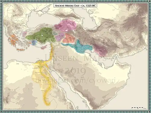 ![]() Map of the Middle East in 1325 BC showing the location of Hittite Empire and the suggested location of the Hayasa Azzi confederation | |||||||