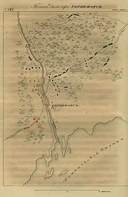 The remaining Swedish forces held the center, along the Hörnån, defending the two bridges going over the river—expect for the Savolax 1st battalion, which was positioned furthest to the right at the river mouth (not engaged), and half of the Jämtland 2nd battalion, which was kept in reserve. At half past ten, after more than two hours of intense fighting, Sandels ordered a retreat after having received a false report claiming that the Russians had encircled his left flank, towards Ängersjö.[2] The Savolax 2nd Battalion under Joachim Zachris Duncker acted as rearguard and covered the Swedish withdrawal; Duncker was mortally wounded under the fierce Russian pressure and his battalion dissolved with significant losses.[3]