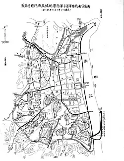 After two days' terrain reconnaissance, the senior officers of the 10th Army concluded that Japanese forces might attack Hengyang from either the northwest or south and southwest. General Fang was sure of the latter, which became the rationale for his troop deployment and defense preparations.[59] The two understrength divisions, the 190th and 54th, were deployed to the east of the Xiang River, with the 54th still defending the airfield. The two full-strength divisions, the 10th and 3rd, were posted to the west of the Xiang.[60] With a long-term strategy in mind, Fang deployed the 10th Division, the weaker of the two, to the major frontline on the south and southwest; and the stronger 3rd Division to the secondary battleline on the north and west, ready to provide relief and support.[61]