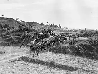 ![]() A Sherman tank of the 19th King George's Own Lancers, getting into position to fire at Japanese lines in the Arakan hills, 22 January 1945 | |||||||