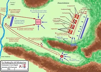 Ancient sources identify the location as Idistavisus,[3] but the precise location is unknown except that it was on the right side of the Weser River,[8] somewhere between the cities of Minden and Hamelin in what is now Germany.[9]