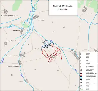 The number of the soldiers of the Gerstner brigade is from the battle order from 11 July 1849. If we add to this the number of casualties of the battle of Ihász (272), and estimate the dropouts in the period between 27 June and 11 July to 100,[2] then the total number of the brigade will be around 4,902 soldiers and 6 cannons.