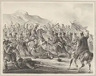 Only the right flank, led by Aristid Dessewffy, withstood the enemy cannon fire.[8] Dessewffy with the 26th Honvéd Battalion managed to stop the attack of the Imperial infantry, and with the Coburg Hussars he forced two enemy guns to retreat.[15] Dessewffy's 42nd Hussars almost reached the enemy's rocket battery on the Akasztófa hill, when the Archduke Wilhelm infantry, which had been in reserve, countered the Honvéd attack in time and even repulsed it with a successful counterattack.[9] At 3.30 p.m. Dessewffy's troops also wavered, but the Lieutenant-Colonel ordered the retreat to Enyicke in time, both for his own troops and for those of Major Rembowszky, who was fighting on his right.[9] It was up to these units - the 26th, 20th Honvéd Battalions, 1 Company of the 17th Honvéd Battalion (the latter two were subordinated to Dessewffy after the centre had been routed), the Polish Legion and the Coburg Hussars - to cover the retreat of the whole corps.[2][15] The biggest problem was the transfer of guns and ammunition wagons across the swift Miszlóka stream, which was made more difficult by the desperate fleeing of some troops, such as the Lehel Hussars, across the stream.[2]