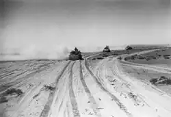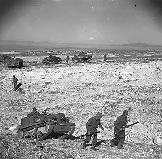 The Sbiba area was attacked by Battle Groups Stenkhoff and Schuette, remnants of the 21st Panzer Division. Facing the German armored advance was the British 6th Armoured Division (less the 26th Armoured Brigade which except for the tanks of the 16/5th Lancers had been sent to Thala). Also in the line was the U.S. 18th Regimental Combat Team from the 1st Infantry Division; and three battalions of infantry from the 34th Infantry Division. There were also three U.S. Field Artillery battalions, elements of two British anti-tank regiments and some French detachments. The Germans made little progress against the combined firepower of the defending force which had also laid minefields.[32] The 21st Panzer Division was checked and then driven back by February 20.[33]