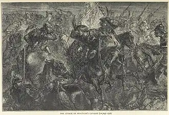 Clashes soon broke out as the Covenanter army made their flank march, with the left wing of Baillie's force (now the rear of the flanking column) attacking the MacLean infantry occupying cottages on Montrose's left flank, and the cavalry on the Covenanter right flank (or van) attacking the Royalist cavalry. Other Covenanter and Royalist units joined the fray, acting without orders. Montrose seized the unexpected opportunity, and sent his cavalry and Highlanders against the now disrupted Covenanter column. The mass of the Royalist infantry subsequently joined in the attack. Baillie's army soon broke and ran in the face of the ferocious "Highland Charge".[7]