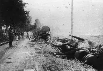 Although Polish forces had formed a coherent defensive strategy, rapid German advances combined with the Soviet invasion led to great disorganization within the Polish's plans.[3] Additionally, Poland also suffered from a lack of trained officers, leading to many formations in the plan not being fully mobilized before the German invasion.[4] Units stationed in Northern Poland, particularly near East Prussia suffered heavy losses and were forced to retreat south and southeast, in hopes of regrouping and establishing positions along natural barriers such as the Vistula and San rivers.[5]