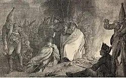 The battle was lost for Frederick—it had actually been lost for the Prussians for a couple of hours—but he had not accepted this fact. Frederick rode among his melting army, snatched a regimental flag,[55] trying to rally his men: Children, my children, come to me. Avec moi, Avec moi! They did not hear him, or if they did, they chose not to obey.[51] Watching the chaos and seeking the coup de grâce, Saltykov threw his own Cossacks and Kalmyks (cavalry) into the fray. The Chuguevski Cossacks surrounded Frederick on a small hill, where he stood with the remnants of his body-guard—the Leib Cuirassiers—determined to either hold the line or to die trying. With a 100-strong hussar squadron, Rittmeister (cavalry captain) Joachim Bernhard von Prittwitz-Gaffron cut his way through the Cossacks and dragged the King to safety. Much of his squadron died in the effort. As the hussars escorted Frederick from the battlefield, he passed the bodies of his men, lying on their faces with their backs slashed open by Laudon's cavalry. A dry thunderstorm created a surreal effect.[52][56][57]