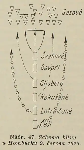 Henry IV's army advanced in five ranks, despite the open terrain south of the River Unstrut. The Saxons rushed out of their castle at Homburg all on horseback, apparently leaving their foot soldiery behind in their haste.[2]
