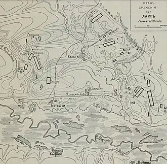The Battle of (the) Larga was fought between 65,000 Crimean Tatars and 15,000 Ottomans under Qaplan II Giray against 38,000 Russians under Field-Marshal Rumyantsev on the banks of the Larga River, a tributary of the Prut River, in Moldavia (now in Moldova), for eight hours on 7 July 1770. It was fought on the same day as Battle of Chesma, a key naval engagement of the Russo-Turkish War, 1768–1774.