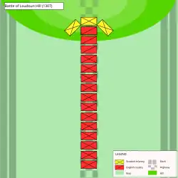 Valence's only approach was over the highway through the bog, where the parallel ditches the king's men dug outwards from the marsh restricted his room for deployment, with the ditches in front of the Scots impeding him still further, effectively neutralizing his advantage in numbers.[5] Valence was forced to attack along a narrowly constricted front upwards towards the waiting enemy spears. It was a battle reminiscent in some ways of Stirling Bridge, with the same 'filtering' effect at work.