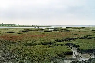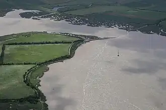 It is clear from the Anglo-Saxon Chronicles that Maldon in Essex is the site of the battle, because of its proximity to Ipswich and because Byrhtnoth was an Ealdorman of Essex.[7] More precise details come from The Battle of Maldon narrative, which describes how the Vikings established themselves on an island, separated from the mainland by a tidal inlet which could be crossed by a "bridge" or "ford" at low tide. The poem describes how the Vikings and Saxons negotiated by calling across the water while waiting for the tide to go out. Northey Island seems to fit this description. An investigation in 1973 suggested that the channel between Northey Island and the mainland would have been about 120 yards (110 metres) rather than 240 yards (220 metres) today. The causeway which crosses the channel today may not have existed in its present form in the 10th century, but there was certainly some form of crossing present. Other sites have been suggested, one being Osea Island which can be reached by a causeway, but is too far from the mainland to shout across. A bridge a mile inland from Maldon, now called Heybridge, has also been suggested, but the river is not tidal at that point.[8]