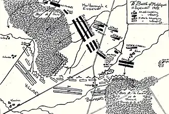 The allies delayed their attack pending the arrival of 21 battalions from Tournai under Henry Withers. This decision was criticised at the time and later, one analyst arguing "the battle should have taken place on 10 September, or not at all".[13] This gave Villars an extra day to construct defensive positions, including earthworks covering the open ground in the centre, and additional entrenchments extending into the woods on either side.[3]