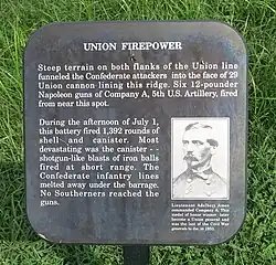 In all, the Confederate artillery barrage on both flanks completely failed to achieve its objectives. Confederate fire did manage to kill Capt. John E. Beam of the Union's 1st New Jersey Artillery, along with a few others, and several Federal batteries (though none that were actually engaged) had to move to avoid the fire. Although the barrage by Lee's forces did claim a few lives, Union forces remained unfazed and continued their fearsome barrage. Indeed, Union Army Lt. Charles B. Haydon supposedly fell asleep during the artillery fight.[44] On both the left and right flanks, several of the batteries that did engage lasted no more than minutes before being rendered incapable of fire.[40] Moreover, in a failure of command that, according to historian Thomas M. Settles, must ultimately be placed on Lee's shoulders, the movements of the two flanks were never coordinated with each other.[45] D. H. Hill found the failure of the Confederate artillery discouraging and later dismissed the barrage as "most farcical".[46]