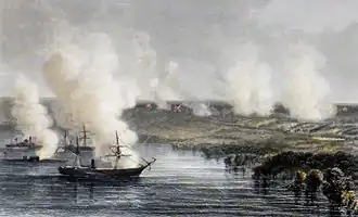The firefight also alerted the three Union boats on the James—the ironclad USS Galena, and the gunboats USS Jacob Bell and USS Aroostook[f]—which began lobbing missiles twenty inches (510 mm) in length and eight inches (200 mm) in diameter from their position on the James River onto the battlefield.[59] The explosions and impacts of the gunboat fire impressed the Confederate troops, but the guns' aim was unreliable, and the large shells did considerably less damage than might have been expected.[60]