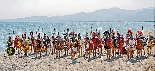 Herodotus does not give a figure for the size of the Athenian army. However, Cornelius Nepos, Pausanias and Plutarch all give the figure of 9,000 Athenians and 1,000 Plataeans;[49][50][51] while Justin suggests that there were 10,000 Athenians and 1,000 Plataeans.[52] These numbers are highly comparable to the number of troops Herodotus says that the Athenians and Plataeans sent to the Battle of Plataea 11 years later.[53] Pausanias noticed on the monument to the battle the names of former slaves who were freed in exchange for military services.[54] Modern historians generally accept these numbers as reasonable.[33][55] The areas ruled by Athens (Attica) had a population of 315,000 at this time including slaves, which implies the full Athenian army at the times of both Marathon and Plataea numbered about 3% of the population.[56]