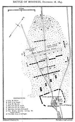 The Battle of Mudki was fought on 18 December 1845, between the forces of the British East India Company and a part of the Sikh Khalsa Army, the army of the Sikh Empire.[3] The British army were able to win the battle, despite suffering heavy casualties in the process.[1]