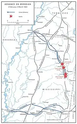 Meridian was an important railroad center, and was the objective of a campaign launched from Vicksburg, Mississippi, on February 3 by Sherman, who brought 20,000 men to the outskirts of the town. Seven thousand cavalry under Smith's command were stationed in Memphis, and on February 1 these were ordered to leave for Meridian along the Mobile & Ohio Railroad and rendezvous with the main Union force on February 10.[1] While Sherman feinted his way towards Meridian to throw off Confederate forces, Smith delayed his own advance for ten days before leaving on February 11. His force moved unopposed through the countryside, destroying railroads and crops as well as picking up 1,000 slaves. On February 16 he passed through New Albany, his progress slowed due to muddy roads. On February 18 he drove a Confederate force from West Point; and he was just outside West Point, 90 miles from Meridian, on February 20 when Sherman eventually left his position in the town and returned to Vicksburg, fearing for Smith's whereabouts.[1] Smith, hearing of this, turned about and headed for Okolona.