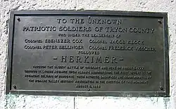 A monument was erected in 1883 to commemorate the battle at 43° 10.6′N 75° 22.2′W,[42] and much of the battlefield is now preserved in the Oriskany Battlefield State Historic Site. The site was recognized as a National Historic Landmark in 1962,[43] and added to the National Register of Historic Places in 1966.[44] The town of Herkimer, New York and Herkimer County, New York were named in Herkimer's honor.[45] The battle was honored by the name of aircraft carrier USS Oriskany, launched in 1945,[46] now an artificial reef,[47] and also by the issuance of a postage stamp in 1977.[48]