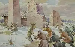 In the evening the Estonians and Finns finally pushed into the park of the estate where heavy hand-to-hand combat started, which resulted in the capture of the manor. Retreating Latvian Riflemen were subjected to heavy fire. The next day the Estonians marched into Valga without resistance.[6]