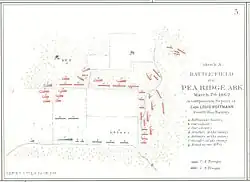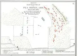 The Battle of Pea Ridge (March 7–8, 1862), also known as the Battle of Elkhorn Tavern, took place during the American Civil War near Leetown, northeast of Fayetteville, Arkansas.[4] Federal forces, led by Brig. Gen. Samuel R. Curtis, moved south from central Missouri, driving Confederate forces into northwestern Arkansas. Maj. Gen. Earl Van Dorn had launched a Confederate counteroffensive, hoping to recapture northern Arkansas and Missouri. Confederate forces met at Bentonville and became the most substantial Rebel force, by way of guns and men, to assemble in the Trans-Mississippi. Against the odds, Curtis held off the Confederate attack on the first day and drove Van Dorn's force off the battlefield on the second. By defeating the Confederates, the Union forces established Federal control of most of Missouri and northern Arkansas.[5]