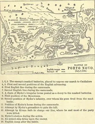 The Battle of Porto Novo was fought on 1 July 1781 between forces of the Kingdom of Mysore and British East India Company in the place called Porto Novo (now known as Parangipettai) on the Indian subcontinent, during the Second Anglo-Mysore War. The British force, numbering more than 8,000 men under the command of Sir Eyre Coote defeated a force estimated at 40,000 under the command of Hyder Ali.[2][3][4]