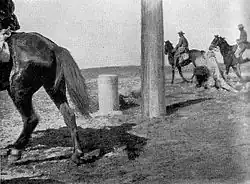 By 06:45 the ANZAC Mounted Division headquarters was established 4.5 mi (7.2 km) west of Karm Ibn Musleh on the frontier to the south of Rafa and El Magruntein. The 1st and 3rd light horse brigades and the artillery took up positions to the south to guard against the Ottoman garrison retreating to the south-east, with the Imperial Camel Corps Brigade located three-quarters of a mile (1.21 km) to the west. The New Zealand Mounted Rifles Brigade was about one mi (1.6 km) to the north with the 5th Mounted Brigade forming the Desert Column's reserve.[23] By 07:00 a patrol of the Wellington Mounted Rifles had cut the telegraph line running east from Rafa towards Shellal and Gaza, isolating the Rafa garrison, Chauvel had reconnoitred the El Magruntein defences and the British Empire horse artillery batteries had begun firing on the redoubts at El Magruntein.[24][25]